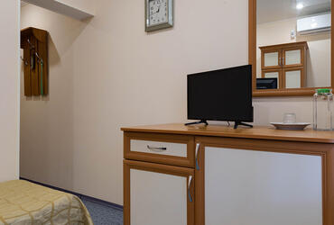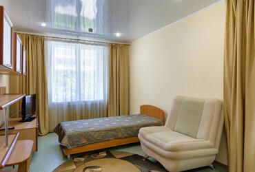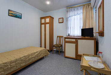 В номере: односпальная кровать, санузел (туалет, умывальник, душ, фен), телевизор, холодиль...