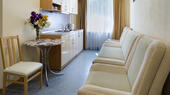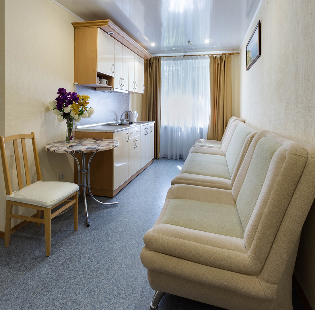 В гостиной — кухонный уголок (с электрической плитой и набором посуды), обеденный стол и стулья, гладильная доска.