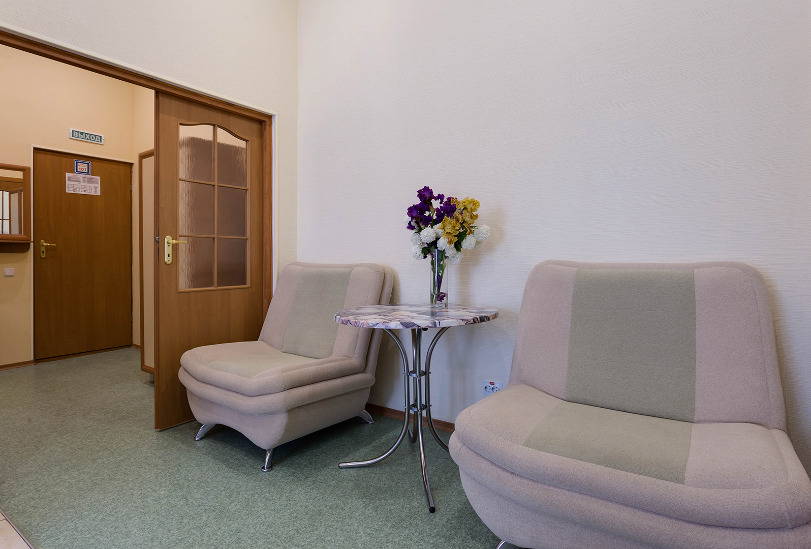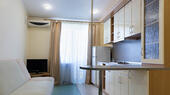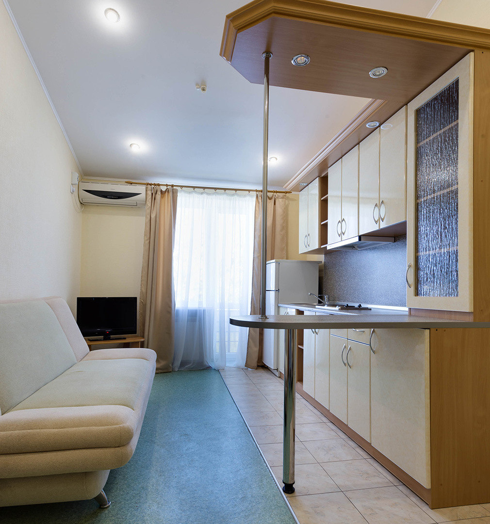 В гостиной — диван, два кресла, кухонный уголок (с электрической плитой и набором посуды), обеденный стол, барная стойка.